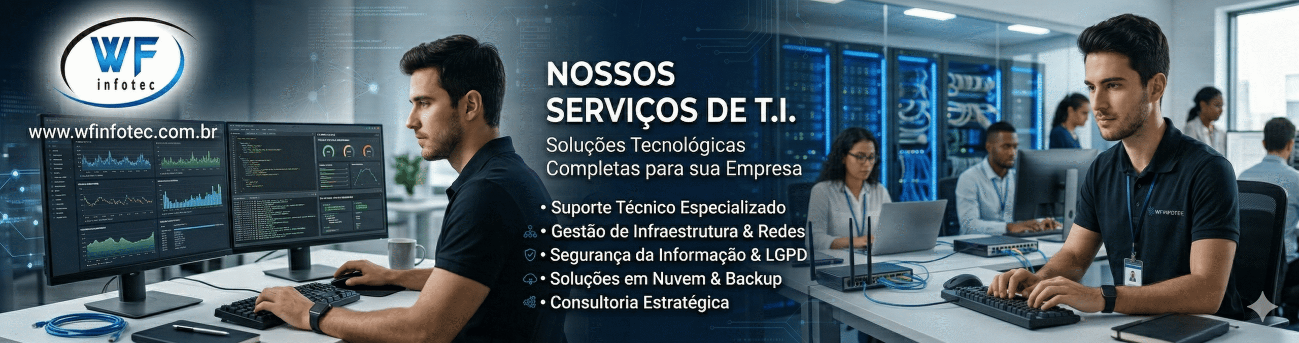 Na Wfinfotec, nossa principal missão é garantir que sua empresa tenha máxima disponibilidade, segurança e performance da tecnologia, sem preocupações ou interrupções no seu dia a dia.